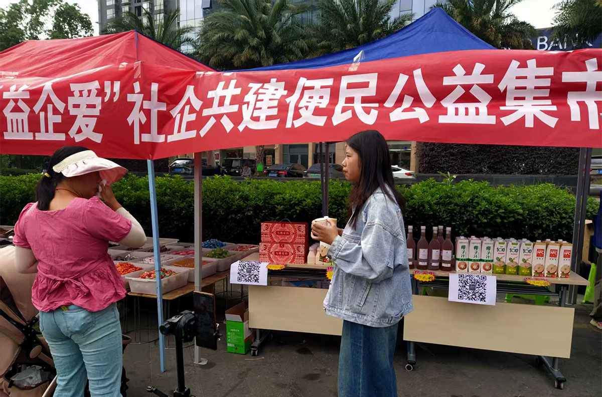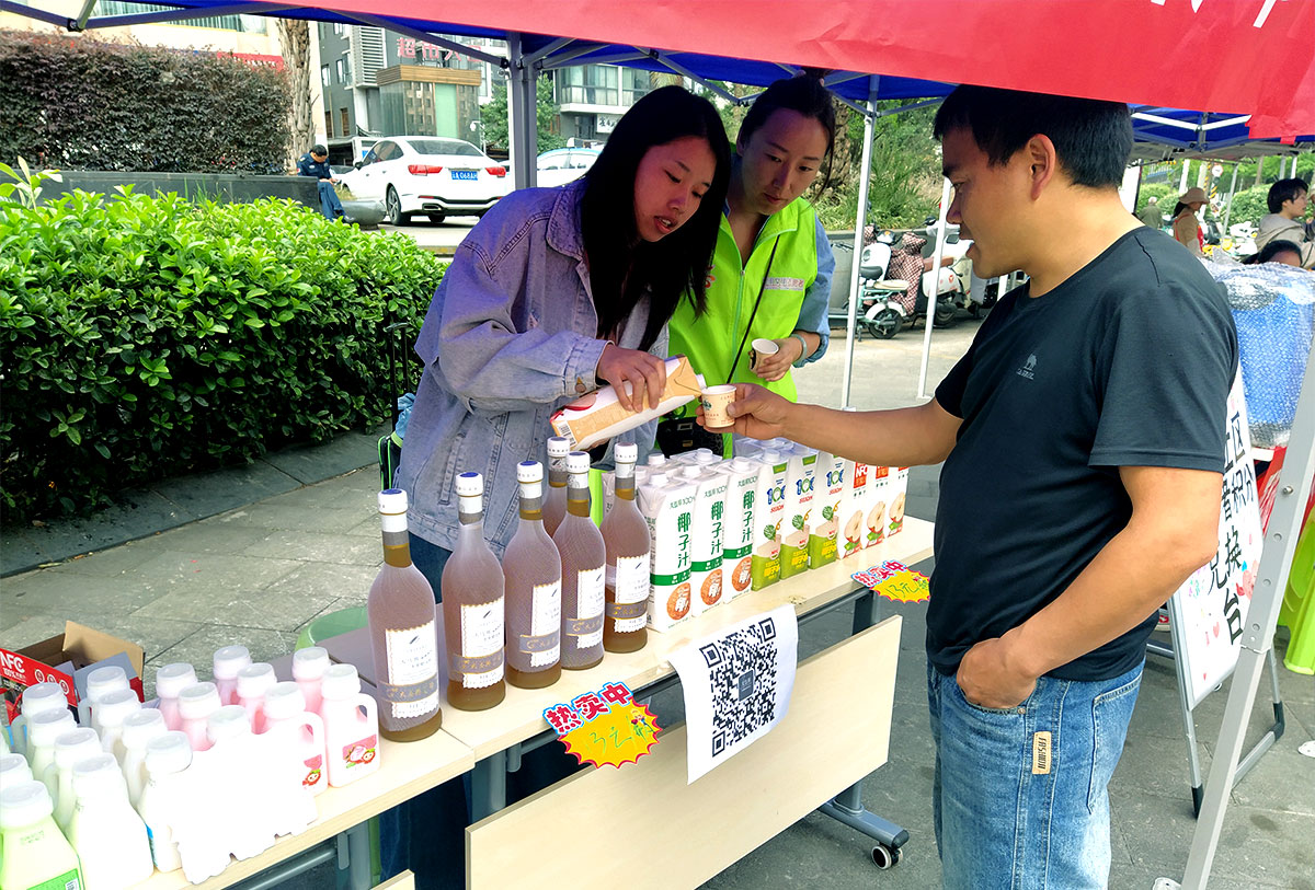 社企共建便民公益集市現場,“大馬邦”展出100%果汁、茶果醋、乳酸菌、桃膠等系列產品,現場熱情邀約廣大居民們試喝。并介紹了不同果汁飲料制作工藝和營養價值,讓居民們了解到健康飲食的重要性。